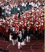 American wrestler Bruce Baumgartner carries the U.S. flag as he leads the United States delegation.