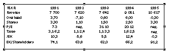 Year 1991 1992 1993 1994 1995 Revenue 7 700 7 620 7 642 9 051 10 617 Overhead 3,70 -7,10 0,80 8,00 -0,30 Shares 3,30 1,10 1,50 2,50 3,30 P/E 7-3 neg. 31-10 20-12 neg. Taxes 3,1-6,2 1,1-2,4 1,1-3,3 1,6-2,5 neg JEK 10,3 -5,8 5,5 12,4 -0,3 EK/Shareholders 74,1 63,8 62,0 66,2 91,2