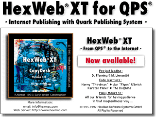 Most features of HexWeb XT for QuarkXPress are enclosed, such as Hyperlinks, Headers & Footers, creating of the Web server structure, automatic tables of contents and LinkChecking. The XTension HexWeb XT for CopyDesk is bundled with the latest version of HexWeb Index Pro. This professional index generator which encompasses the new Hotsauce feature (and several other index options), generates fully indexed Web issues of newspapers and magazines within seconds.