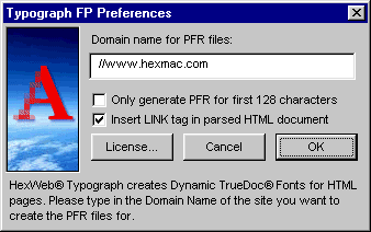1. Unpack the Typo32FP.exe file and run the installation program. In the end of the installation, you are asked to type in a site domain. PFR files are copy protected, and can be run only under the site domain they were created for. This version of Typograph allows you to change the domain in the preferences dialog, in case you are working for another site.2. Start HexWeb Typograph by opening the "test.htm" file with your Microsoft® FrontPage® Editor. Then open "HexWeb Typograph" palette from the "Tools" menu by selecting "HexWeb Typograph".