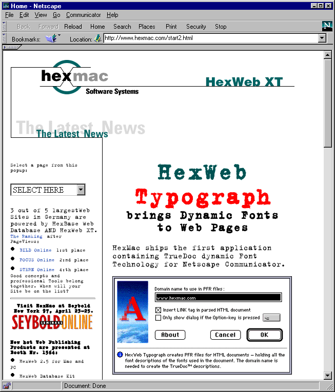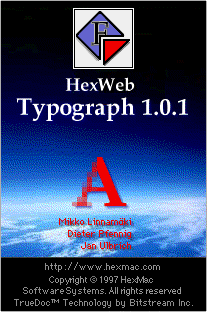 HexMac ships HexWeb Typograph, the first Web authoring application supporting the innovative TrueDoc dynamic Font Technology which enables Web designers to maintain the original look and feel of their documents.